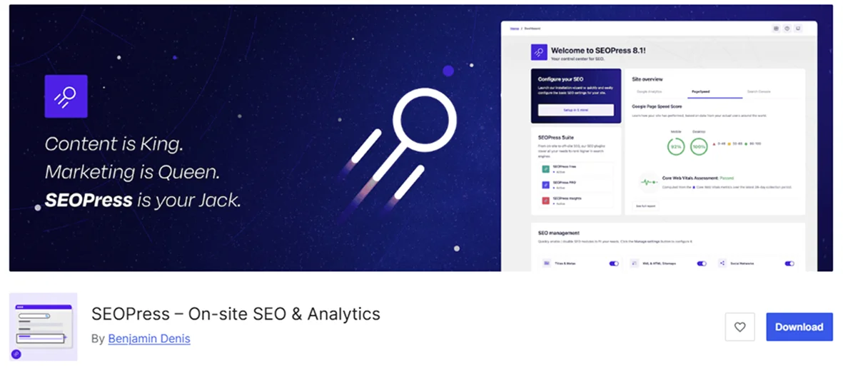 Best For: Performance-focused sites that need comprehensive SEO without plugin bloat.